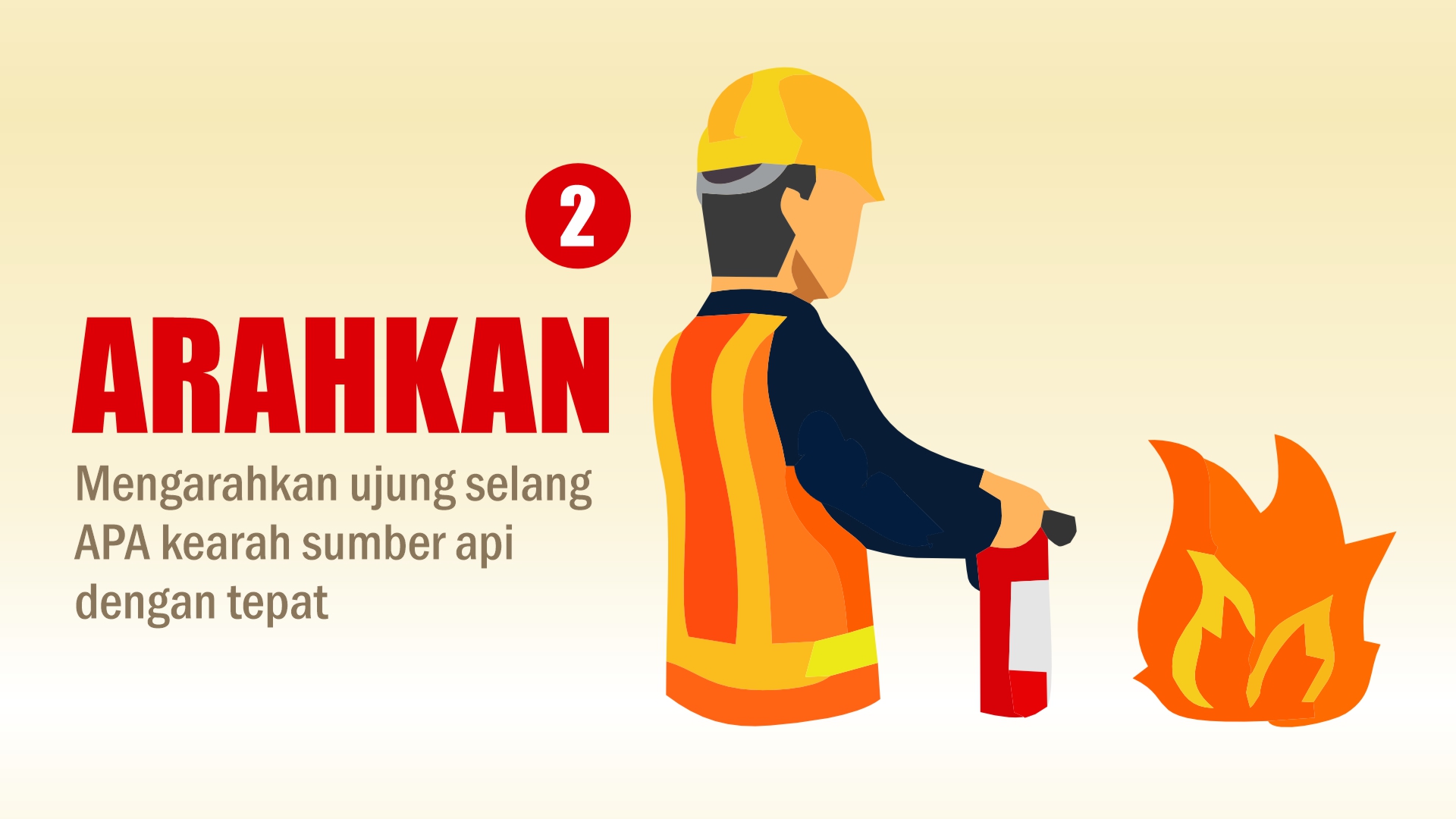 Prosedur yang kedua, mengarahkan ujung selang APA kearah sumber api dengan tepat. Selalu pegang selang APAR pada bagian ujungnya, bukan di tengah ataupun pangkal untuk mencegah resiko media untuk memadamkan api tidak terarah dengan tepat.